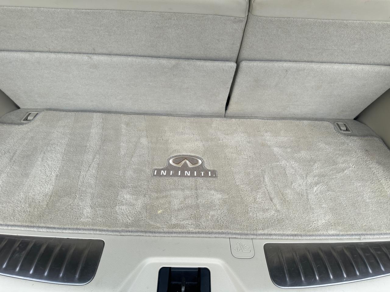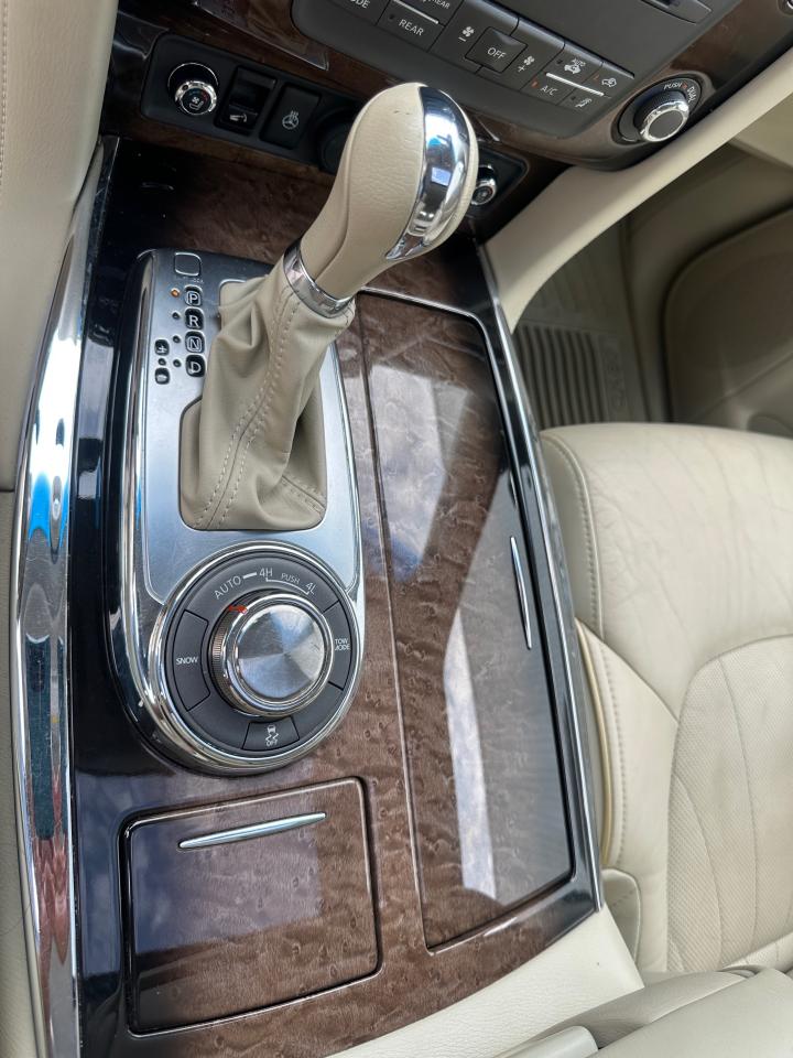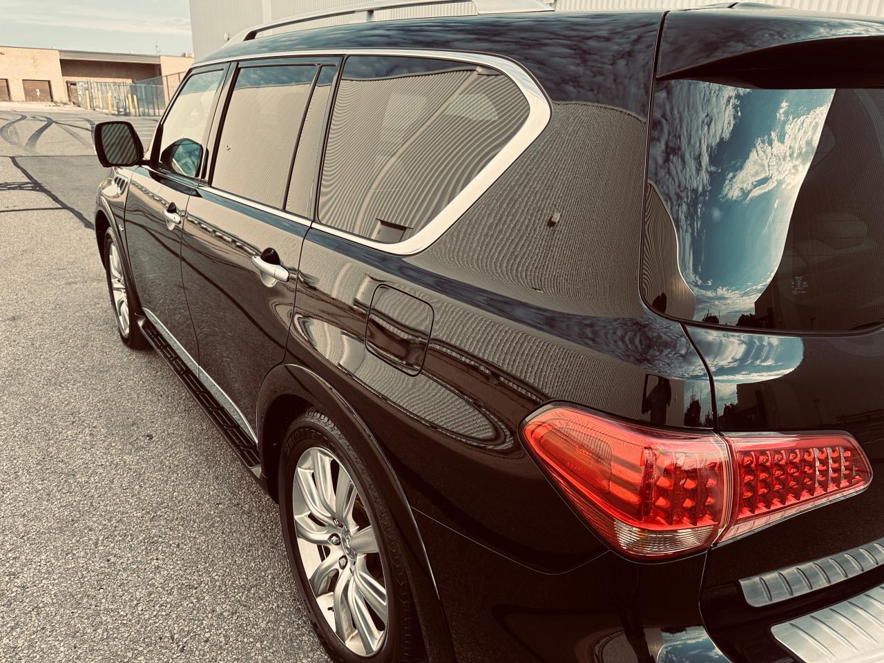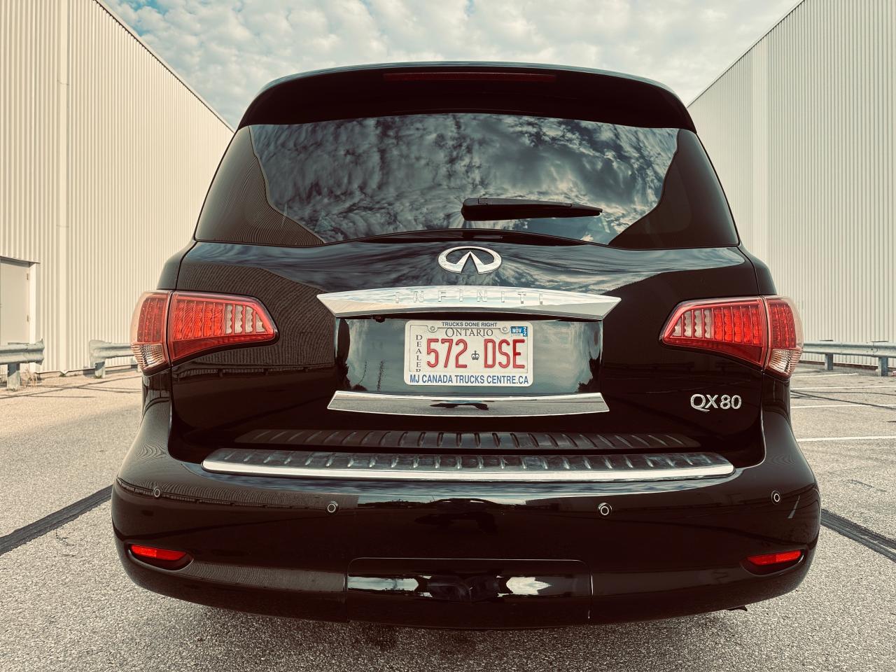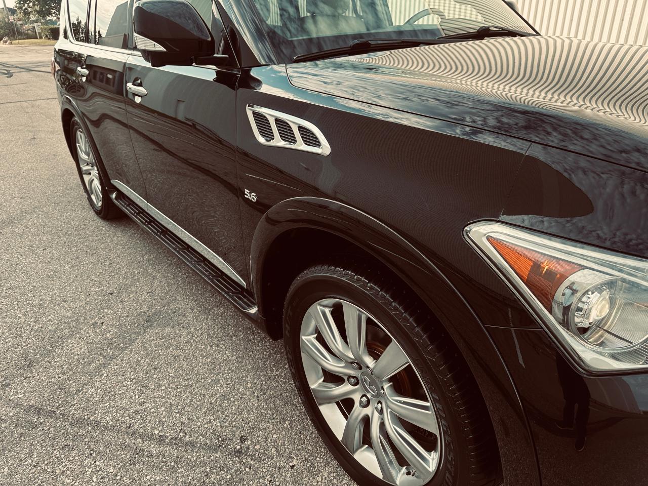 Rare Spec 2014 Infiniti QX80 Premium 8 Passengers 4WD with only 73,494 kilometers, proudly owned by one local Ontario owner since new. This luxury SUV has never been in an accident or suffered any damage, as verified by a clean Carfax report. It has lived a gentle life, always garage-kept in a high-end household and never exposed to harsh conditions. Finished in elegant black metallic over a refined bone leather interior, this fully loaded 8-passenger QX80 offers high levels of comfort, luxury, and advanced technology. Equipped with a powerful 5.6L V8 engine, smooth 7-speed automatic transmission, intelligent AWD, heated front and rear seats, heated steering wheel, factory navigation system, Bose premium audio, dual rear entertainment screens, around-view 360° camera, tri-zone climate control, power moonroof, power tailgate, factory running boards, roof rails, towing package, and 22” alloy wheels. This is a premium SUV in exceptional shape and condition, ideal for those seeking space, power, and luxury in one well-cared-for vehicle. Please call ahead to book an appointment. Visit us online at www.MJCanadaTrucksCentre.ca.