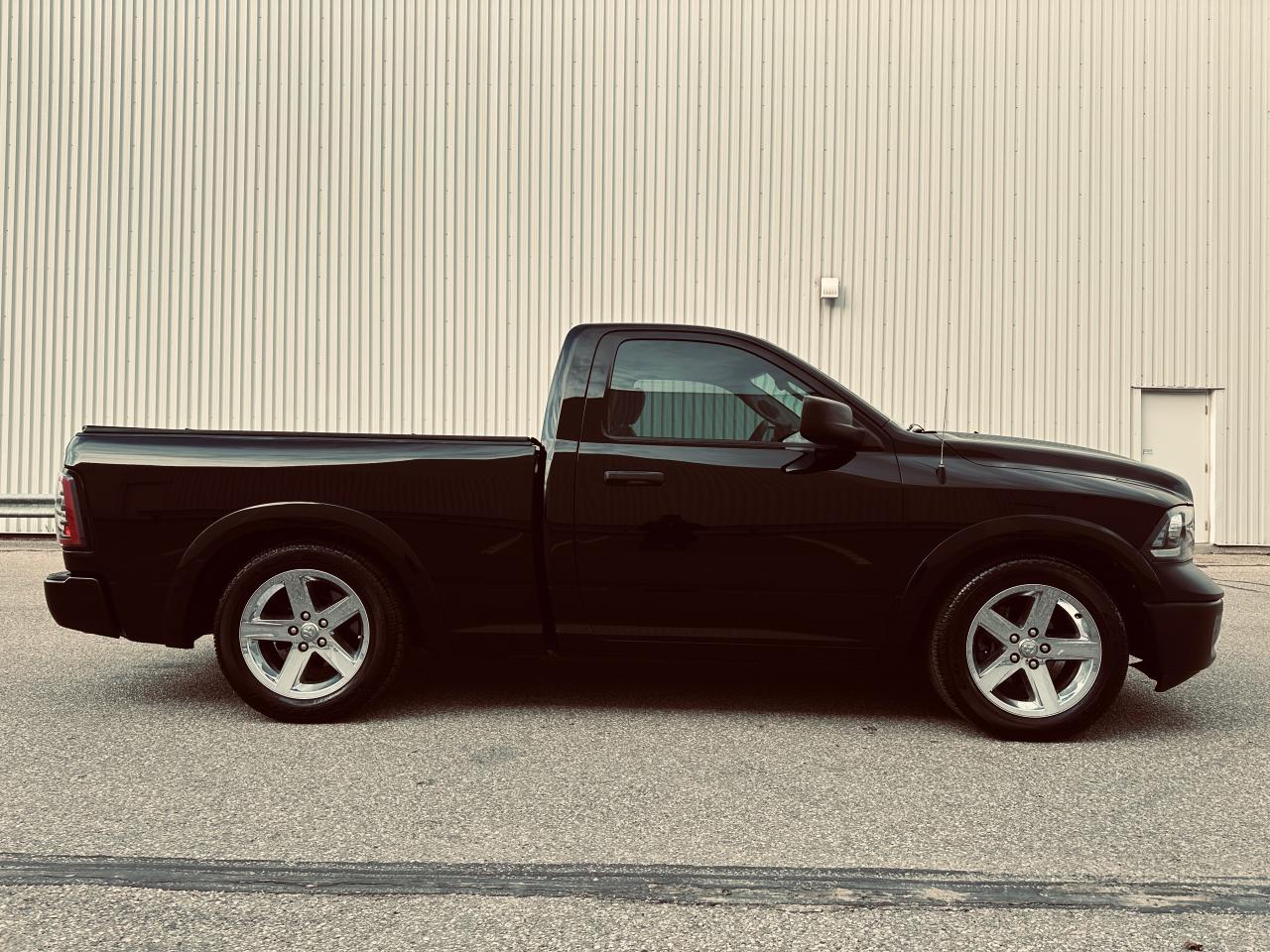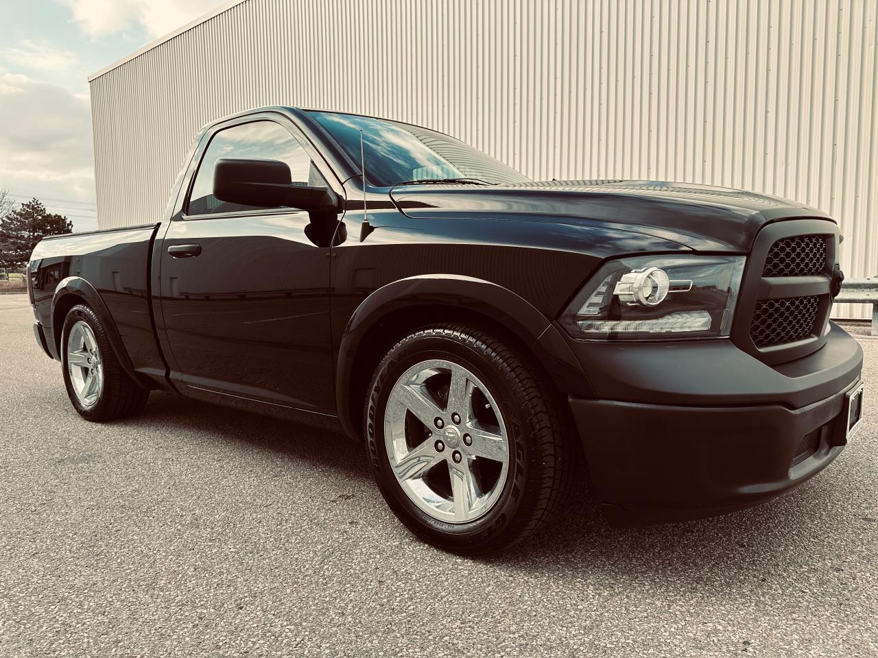 RARE OPPORTUNITY TO OWN A REGULAR CAB BLACK SHORT BOX 2 DOOR RAM WITH HEMI LOW KMS , NO ACCIDENTS HISTORY ACCORDING TO CARFAX HISTORY REPORT ( VERIFIED ), POWERFUL 5.7 HEMI ENGINE, TRAILING PACKAGE, DUAL EXHAUSTS, 20" CHROMES & HIGH-END RUBBER, ARTIFICIAL LEATHER SEATS, HIGH-END EXHAUSTS / HEADLIGHTS/ TAILLIGHTS, KEYLESS ENTRY/START, BED LINER & HARD COVER, GOOD AMOUNT OF $ SPENT ON MANY UPGRADES, ALMOST MINT CONDITION.